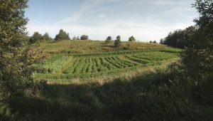 Spiralni labirint je nizek, a morda je tudi to ravno kot mora biti, kajti lepo je viden z roba njive. Da bi konoplja zgolj ne bila samo konoplja, smo tudi vanjo vrezali labirint. Ta še ni popolnoma končan, saj izhoda ven še ni, razen nazaj od koder si prišel.